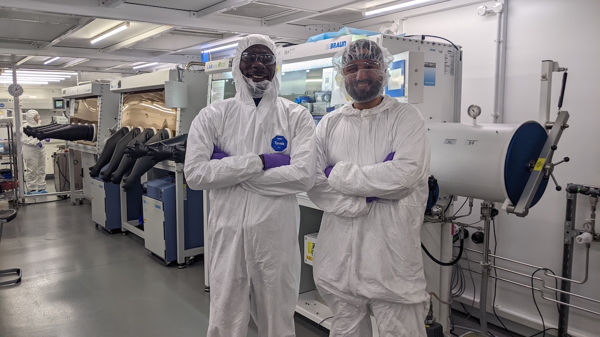 Bottom left: John Anyanwu (FUTO, Nigeria) pictured with Ershad Parvazian (Swansea University) during his visit to Swansea University to take part in perovskite solar module training.